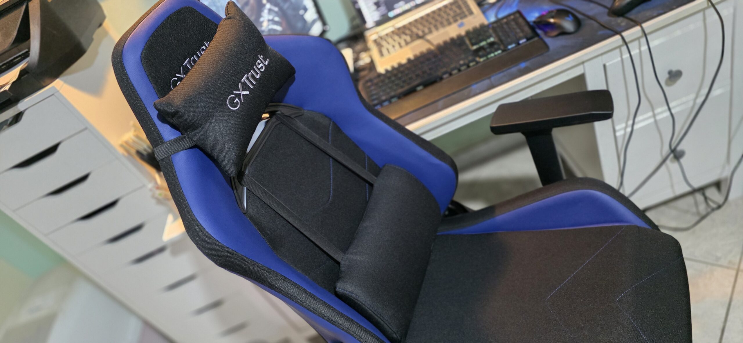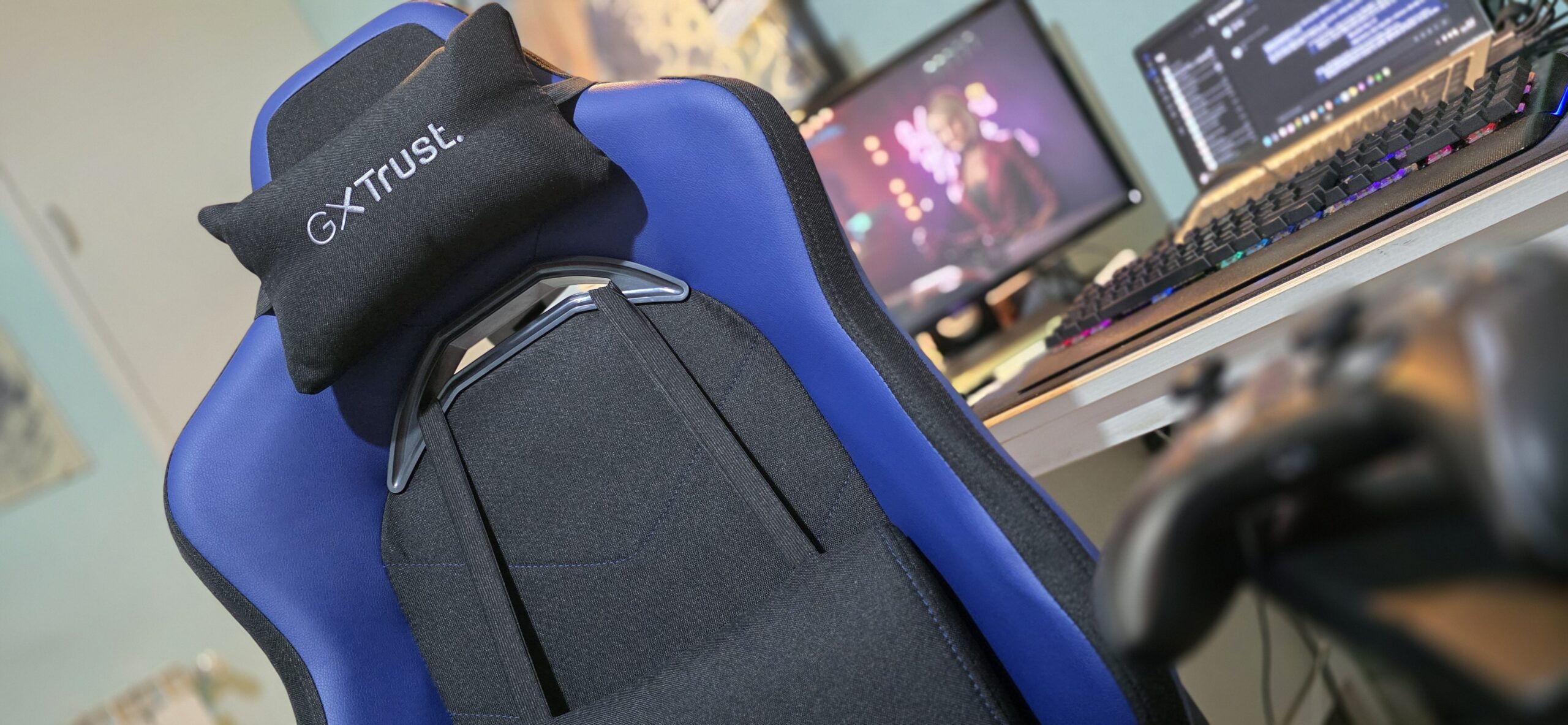 Una volta assemblata, la Ruya si è rivelata una sedia dal design accattivante, con un look da auto da corsa che strizza l’occhio agli appassionati delle livree accattivanti. Il piccolo cuscino poggiatesta, pur non essendo il massimo del lusso, offre un comfort apprezzabile durante le lunghe sessioni di gioco o lavoro. La versione che ho testato era tinta di un vivace blu royal, molto simile all’elettrico, ma Trust ha messo a disposizione altre colorazioni come un sobrio nero uniforme, un bianco classico e il rosso per chi desidera un tocco di aggressiva originalità. Dal punto di vista tecnico, la Ruya si distingue per la sua encomiabile polivalenza: la larghezza della seduta di 40 cm e il meccanismo di sollevamento a gas, che supporta fino a 150 kg, la rendono adatta a diverse corporature, mentre il supporto lombare, regolabile tramite cinghie elastiche, è un dettaglio che ho apprezzato parecchio, in quanto consente di personalizzare la seduta in base alle proprie esigenze posturali e si rivela di gran lunga più confortevole e affidabile di tanti altri analoghi. Insomma, per quanto il montaggio richieda qualche minuto, il risultato finale ripaga ampiamente lo sforzo.