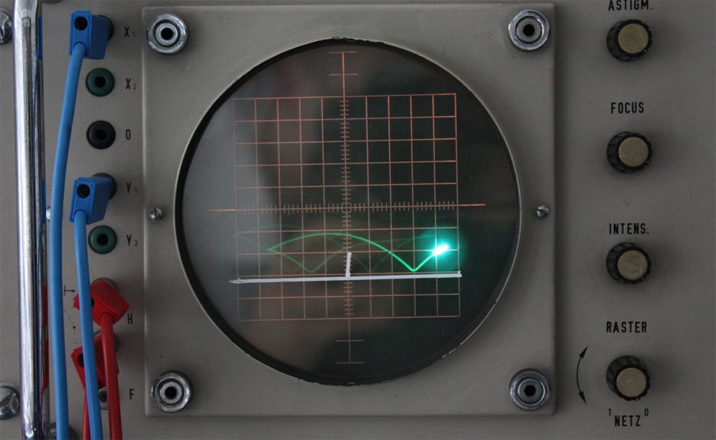 Il monitor dell’oscilloscopio era l’output grafico. Le linee bianche rappresentano un campo da tennis visto di profilo, mentre quella blu con la scia è la palla che rimbalza.
