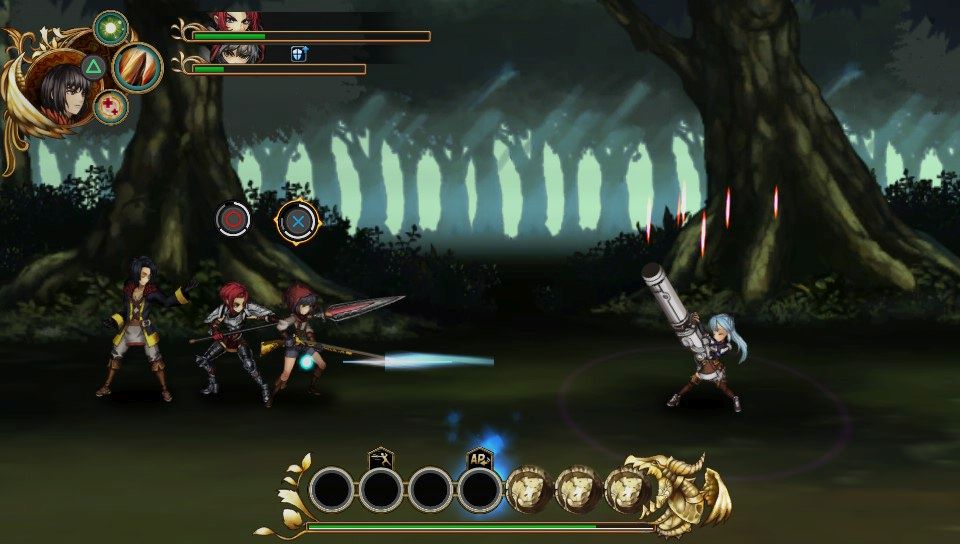 A livello di gameplay di questo titolo a scorrimento in 2D non eccelle in niente ma fa tutto abbastanza bene. Superato l’impatto iniziale con la turnificazione non proprio chiarissima, si riesce a godere del modello di gioco abbastanza a lungo. Per sconfiggere i nemici che ci troveremo davanti potremo “controllare” un party, personalizzabile all’inizio di ogni missione, di massimo 4 personaggi, ognuno con le proprie specifiche caratteristiche. Sia Laendur che Cecille, infatti, non entreranno mai direttamente in combattimento, limitandosi a castare tre differenti magie (equivalenti a Resurrezione, Attacco e Guarigione) dalle retrovie. I controlli di lotta saranno assegnati ai vari membri del party e ad ogni pulsante premuto corrisponderร  un attacco da parte di uno dei nostri sottoposti. Questo sistema inizialmente puรฒ scombussolare: ci ritroveremo infatti, nelle prime battute di gioco, a schiacciare quanto piรน velocemente possibile tutti i tasti. A lungo termine, perรฒ, il modello rivela un fondo di tattica che sarebbe stato interessante approfondire: combinando gli attacchi del party, infatti, andremo a riempire una barra a fondo schermo che libererร  un attacco speciale se riempita senza interruzioni. Purtroppo perรฒ, il roster di personaggi a nostra disposizione si rivela piรน limitato di quanto ci si possa aspettare e. dopo un paio di prove, รจ facile individuare quale combo provochi piรน danni, favorendo la ripetitivitร . Inoltre la possibilitร  di compiere solo tre attacchi per ogni membro del party limita un po’ il sistema di gioco. Ad animare un po’ l’azione, quindi, intervengono le scelte morali: durante le fasi di non combattimento saremo chiamati a prendere alcune decisioni riguardo le sorti del regno, guadagnando differenti bonus in base alla risposta che daremo. Oltre a queste modifiche di stato temporanee, perรฒ, le scelte non avranno grosse ripercussioni sulla trama, pertanto a lungo andare sceglieremo i perk che piรน possono servire alla causa del momento, tralasciando il fattore morale della decisione.