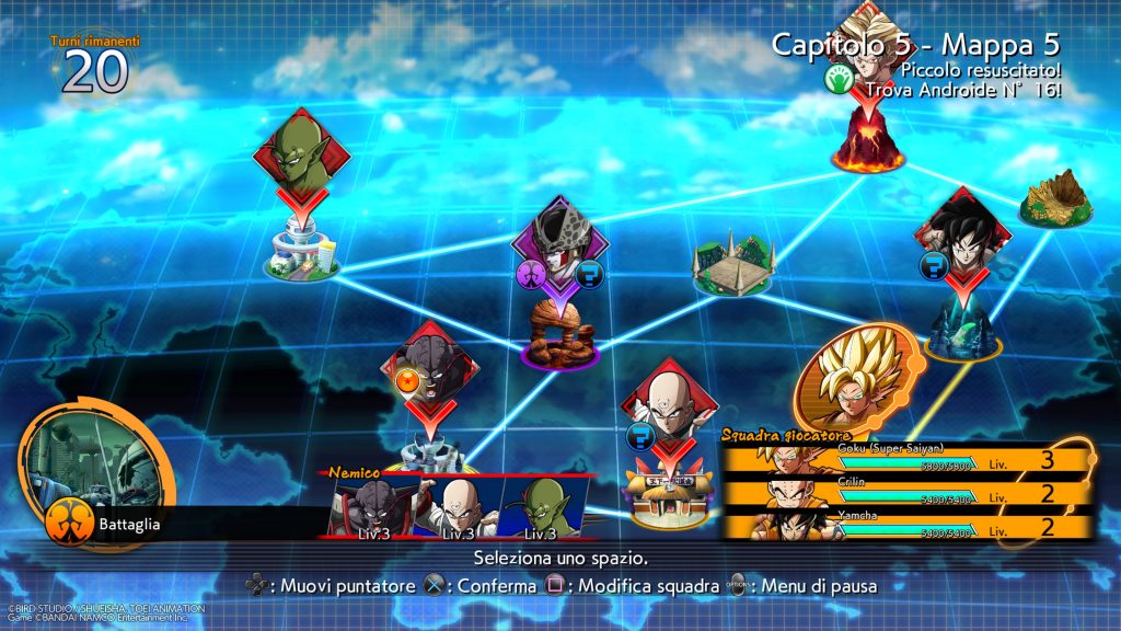 Per avanzare nelle vicende, ogni volta ci troveremo davanti una mappa con vari scenari e un determinato numero di turni nel quale completarla. Ogni luogo potrebbe essere occupato o meno da una squadra nemica e, nel caso ci trovassimo a passare di lรฌ, sarร  nostro compito sconfiggere gli avversari per avanzare. La vittoria darร  esperienza ai combattenti presenti in campo, che saliranno cosรฌ di livello e aumenteranno la connessione tra anima e corpo, rigenererร  una determinata quantitร  di punti vita e rilascerร  un esiguo numero di zeni. Per non lasciare nulla al caso, un indicatore in basso a destra segnalerร  il tipo di combattimento: il tutorial dove potremo padroneggiare semplici tecniche prima di infliggere il colpo di grazia, il salvataggio tramite il quale faremo entrare nel roster di personaggi selezionabili nella storia un nuovo combattente e il boss, ovvero l’ultimo nemico della partita. Se inizialmente vorremo ripulire tutta la mappa prima di concludere il capitolo, ben presto il procedimento risulterร  purtroppo ripetitivo e inizieremo a lasciare nemici dietro, avanzando cosรฌ nella storia.