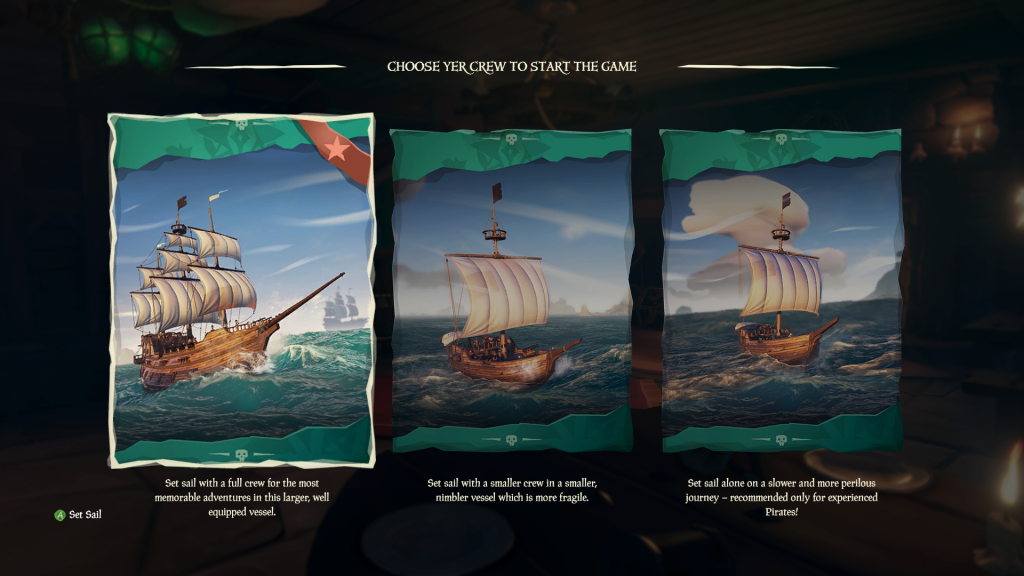 Il titolo ha l’obiettivo di riprodurre in tutto e per tutto la vita di un pirata, fornendo una serie di cacce al tesoro, ognuna divisa in capitoli, a cui possiamo partecipare dopo aver acquistato la mappa da un negozio situato nella base: l’intero gameplay è infatti basato sull’esplorazione e su ciò che si incontrerà nel mentre. Una volta avviato Sea of Thieves, verrà chiesto di inserire il proprio nickname e di selezionare una delle tre modalità: ciurma da quattro persone, con vascello più grande e resistente, ottima anche ai più inesperti, equipaggio da due, con imbarcazione di medie dimensioni, per chi ha già familiarità con le meccaniche e infine la modalità in solitario, non adatta alle battaglie navali, per i più preparati. Noi abbiamo scelto la ciurma da quattro: deciso il percorso da intraprendere, la nostra avventura ha inizio senza esitazioni, difatti si viene immediatamente catapultati in game, con il proprio equipaggio, senza alcuna spiegazione sul da farsi, fatto che potrebbe far storcere il naso ad alcuni player, ma che aumenta l’alone di mistero che permea il gioco. Tutti insieme bisognerà quindi dirigersi verso un’imbarcazione ormeggiata vicino al luogo di spawn, salire e iniziare il nostro viaggio in mare. Il titolo si presenta come un’avventura in prima persona mescolata a componenti action, dove enigmi ambientali e meccanici fanno da padrone.  L’utente ha un inventario a ruota limitato contenente oggetti utili quali cibo con cui ripristinare salute, vanghe per scavare e bussole per orientarsi: inoltre si avranno a disposizione due armi da tiro, a corta e lunga gittata, e una spada.
