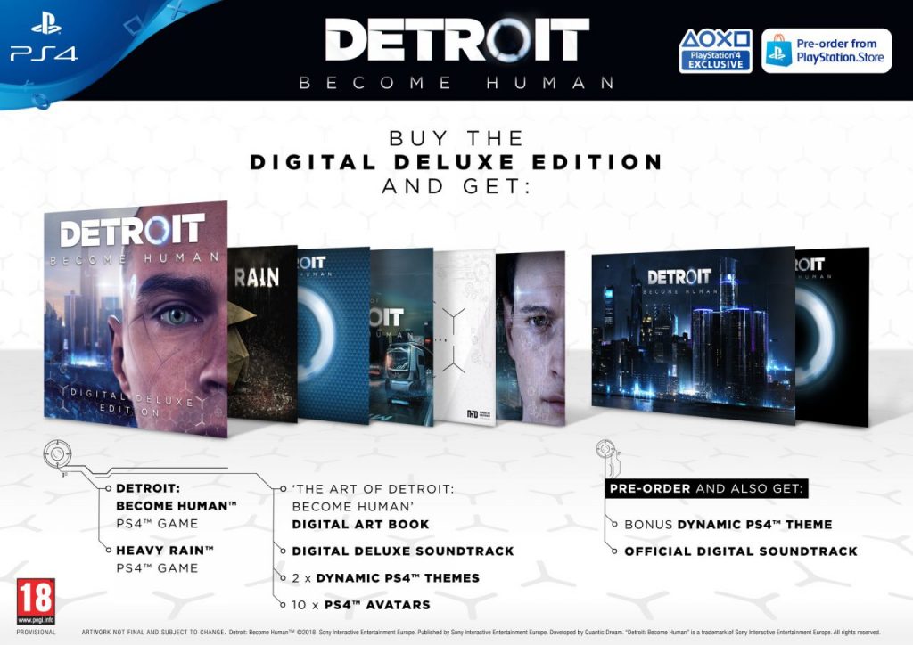 Dopo l’improvviso annuncio di Quantic Dream, è stata svelata la versione Digital Deluxe Edition di Detroit: Become Human, la nuova avventura grafica firmata da David Cage. Questa speciale edizione digitale, presentata sulla pagina Twitter della compagnia francese, conterra quanto segue: