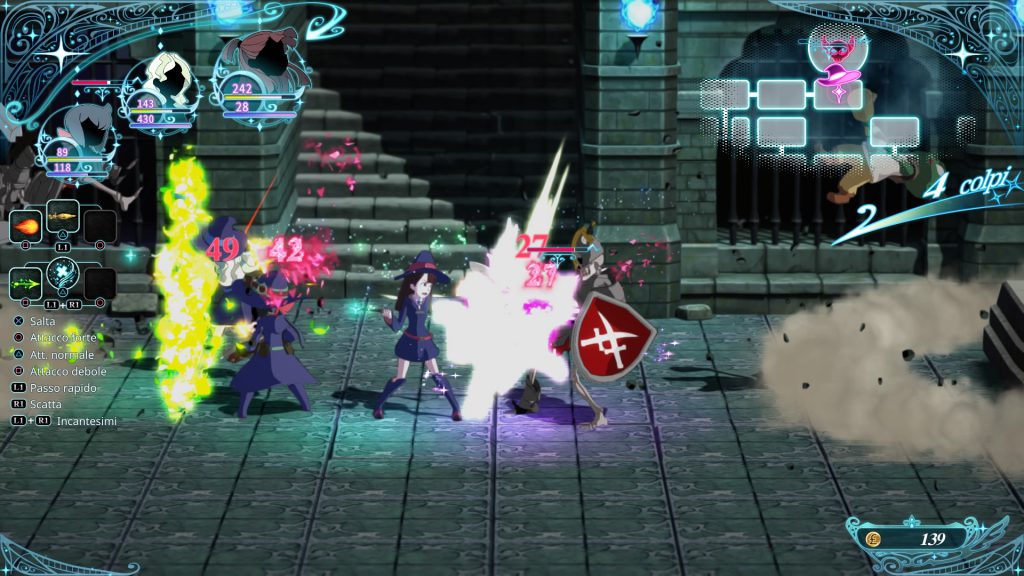 La voglia di girare per Luna Nova, perรฒ, รจ tanta, e dopo corse a destra e sinistra vi sembrerร  veramente di far parte dell’accademia. Inizialmente tenderete a perdervi per scale e corridoi, e aprirete e chiuderete la mappa dell’edificio in continuazione. Poi perรฒ, a poco a poco, la vostra memoria inizierร  a lavorare nel modo giusto. Il cuore di Little Witch Academia: Chamber of Time, perรฒ, รจ sicuramente quello relativo ai combattimenti all’interno dei dungeon della camera dell’Horologium. Sparse per l’istituto troverete delle chiavi che attiveranno particolari zone di questa stanza. Alcune saranno fondamentali per mandare avanti la missione principale, altre (le minori) serviranno soprattutto per trovare oggetti per le sub-quest, equipaggiamenti e per livellare. Ogni dungeon รจ formato da un certo numero di stanze e in ognuna di queste potrete trovare dei mostri, dei tesori o dei boss (che sono segnati e ben visibili).ย Fin dall’inizio del gioco avrete a disposizione le 7 protagoniste della storia: le giร  citate Akko, Lotte e Sucy, piรน Amanda, Constanze, Jasminka e Diana. Ognuna di loro avrร  a disposizione tre attacchi base diversi a cui potrete unire sei diverse magie, di cui parleremo nel paragrafo successivo. Ogni volta che entrerete in un dungeon dovrete portarvi una strega a capo del gruppo (che sarร  quella che utilizzerete voi) piรน altre due di supporto che muoverร  la CPU. Il capo del gruppo scelto darร  dei diversi bonus alla formazione durante la discesa nelle segrete (se sceglierete Constanze, ad esempio, verrete aiutati in battaglia dai suoi minibot).