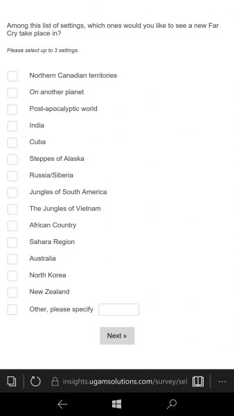 Dopo l’imminente rilascio di Far Cry 5, Ubisoft ha lanciato un nuovo sondaggio dedicato a Far Cry 6, domandando ai giocatori quale ambientazione preferirebbero in questa inedita iterazione. Osservando bene l’immagine, la compagnia ha chiesto l’opinone degli utenti per la location. Secondo una lista pubblicata dall’azienda, sarà possibile scegliere le seguenti regioni: Nuova Zelanda, Canada Settentrionale, Corea del Nord, Siberia, Alaska e Vietnam. Allo stato attuale, non abbiamo informazioni sul progetto, ma aspettiamo maggiori dettagli sul titolo. Con questa notizia abbiamo non abbiamo nient’altro da dirci, seguiteci su VMAG.