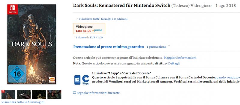 Annunciato durante il Nintendo Direct Mini, Dark Souls Remastered è stato poi posticipato per Nintendo Switch, mentre per le altre piattaforme è uscito il 25 maggio. I giocatori della console ibrida da tempo si chiedono quando potranno mettere le mani anche loro su questo interessante ritorno, che rappresenta l’arrivo della serie su hardware Nintendo. Amazon Italia ha segnato come data di lancio il 1 agosto 2018, per la versione tedesca dell’opera. Potrebbe trattarsi semplicemente di un sengaposto, o placeholder, ma comunque la release ufficiale non dovrebbe essere tanto distante. Aspettiamo che Bandai Namco ci faccia sapere di più, magari tramite un comunicato. Intanto, potete rimanere connessi su VMAG per non perdere eventuali aggiornamenti sulla faccenda. Se non lo avete già giocato, invece, avete l’occasione di leggere la nostra recensione e scoprire di cosa si tratta e se vale l’acquisto.