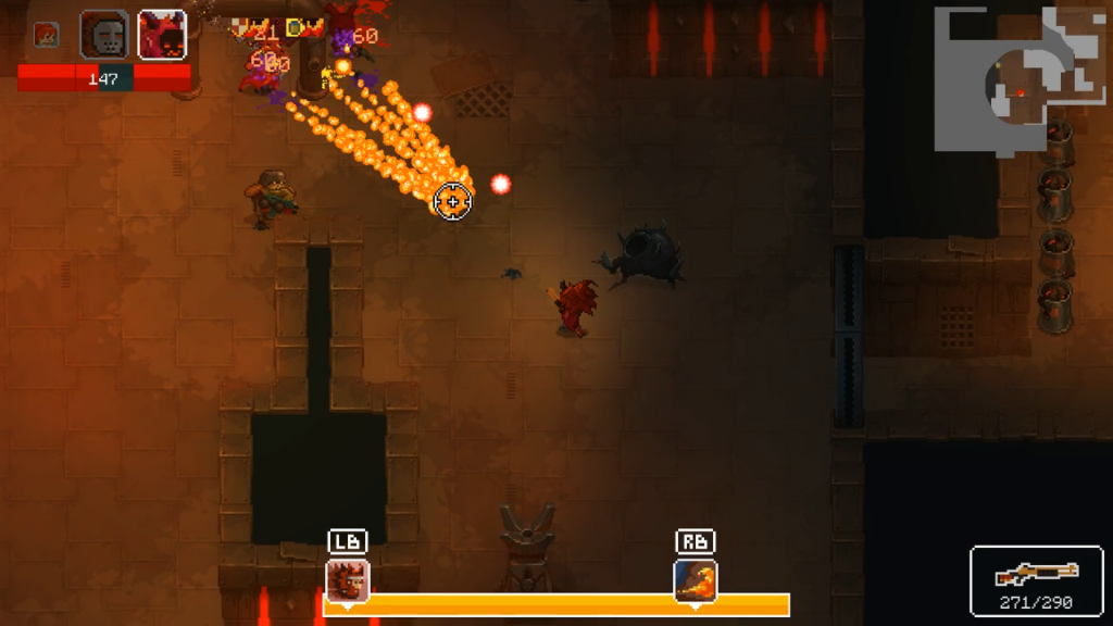 To Hell with Hell è un dungeon crawler bullet hell, in cui per avanzare al livello successivo dobbiamo obbligatoriamente eliminare ogni nemico presente nel piano. Durante l’esplorazione della mappa, che è generata casualmente, possiamo trovare armi e maschere. Le prime possono essere sia da fuoco che corpo a corpo, e,  nonostante ci sia una buona varietà nell’arsenale da raccogliere, questo è ancora nettamente inferiore a quello di Enter the Gungeon. In particolare la armi bianche sono tutte molto simili, e differiscono l’una dall’altra praticamente solo nell’aspetto. Le maschere invece sono degli oggetti creati da Asmodius che contengono l’essenza di un demone, e permettono alla protagonista di trasformarsi una volta indossate. Ognuna di queste dà a Natasia due abilità passive e due attive, inoltre ogni maschera ha una sua barra degli HP. Una volta che i punti vita di una di esse vengono azzerati, questa si rompe, e quindi ne perdiamo tutti i benefici. Come abbiamo riportato nell’introduzione, To Hell with Hell è un titolo che intende offrire al giocatore una sfida davvero impegnativa, che a volte però può risultare anche ingiusta. Infatti, se siamo particolarmente sfortunati e i nemici non ci lasciano munizioni o cure, potremo perdere pur non avendo commesso errori gravi. Un altro fattore che sicuramente rende il gioco più arduo è che non avremo alcun periodo di invulnerabilità dopo essere stati feriti da un colpo nemico. Per questo motivo spesso capita di perdere in un batter d’occhio una o più maschere. Dovremo quindi avanzare con cautela e, soprattutto, non farci prendere dal panico, per evitare di essere sopraffatti.