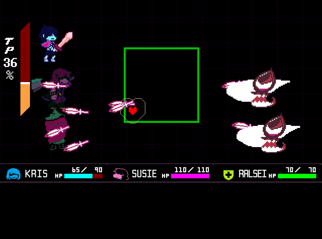 Il gameplay di Deltarune è semplicemente un’evoluzione di quello del predecessore, anche se ci sembra che alcuni aspetti siano stati leggermente trascurati. Una delle differenze più importanti è ovviamente che ora controlliamo ben 3 personaggi diversi, e già questo rende gli scontri molto più strategici e interessanti. Ognuno dei guerrieri della luce ha abilità differenti: Kris può usare il comando ACT per persuadere i nemici o in alcuni casi supportare il party con dei buff, mentre Susie e Ralsei hanno rispettivamente delle potenti magie offensive e di guarigione. Per usare gli incantesimi dovremo consumare i TP, ovvero Tension Point. Questi punti possono essere ottenuti durante la battaglia usando il comando Defend, che diminuisce anche il danno ricevuto nel turno successivo, e al termine dello scontro vengono convertiti in denaro. Ma c’è anche un altro modo, più rischioso, per guadagnare in fretta TP: passare vicino ai proiettili dei nemici. Questa meccanica è stata molto probabilmente mutuata dalla “Graze” di Touhou Project. Infatti, come dichiarato dallo stesso Toby in una recente intervista insieme a ZUN, la nota serie di danmaku shooter è stata una delle principali fonti di ispirazione, insieme a Super Mario RPG, Mother e Moon (un gioco uscito solo in Giappone), di Undertale. In ogni caso, questa meccanica è una manna per i giocatori più esperti del genere shoot ‘em up, poiché spinge ad avere uno stile più aggressivo e premia chi ha il sangue freddo di rischiare. Un’altra novità piuttosto piacevole è la rimozione degli incontri casuali, infatti ora è possibile vedere i nemici prima di iniziare uno scontro, e in tal modo a volte possiamo anche evitarli.
