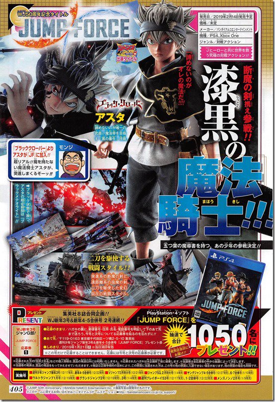 L’ultimo arrivo della rivista giapponese Weekly Shonen Jump ha svelato che Asta, personaggio proveniente da Black Clover, entrerà a far parte del roster di Jump Force. Sarà quindi giocabile e utilizzerà due armi, la Demon-Slayer Sword e la Demon-Dweller Sword. Può inoltre assumere la sua forma “Black Asta” per mettere a segno il suo potente attacco speciale. Ricordiamo infine che Jump Force arriverà il prossimo 15 febbraio su PlayStation 4, Xbox One e PC. Di seguito potete vedere l’estratto della rivista con l’annuncio di Asta: