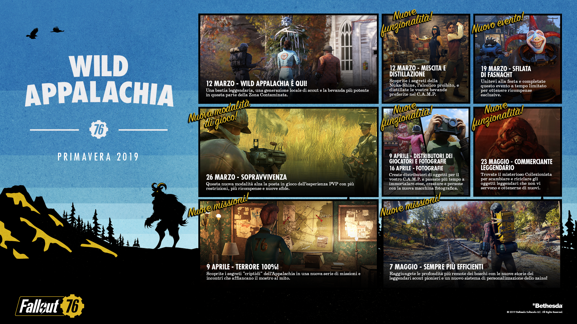Questo 2019 si prospetta ricco di contenuti per i fan di Fallout 76, Il titolo uscito esattamente 100 giorni fa è stato definito da molti giocatori un prodotto incompleto, per via dei suoi molteplici bug. Bethesda ha voluto ringrazierei i suoi fan per la loro pazienza e i loro feedback comunicando la cronologia degli aggiornamenti gratuiti per il 2019. Diamo uno sguardo più da vicino a quello che ci aspetta.