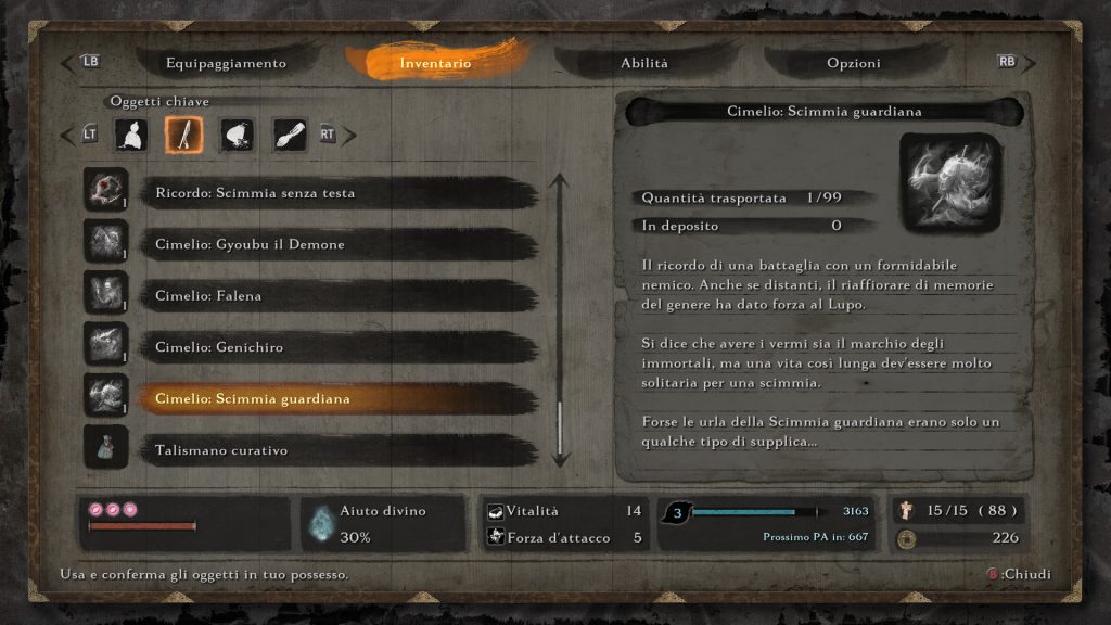 Ovviamente non è finita qui: pensavate che Miyazaki si sarebbe fatto scappare l’occasione per inserire una seconda fase completamente diversa dalla precedente? La scimmia, ora senza testa, userà proprio lo spadone che aveva conficcato nel collo per attaccarci. Durante questa fase le castagnole non sortiscono più alcun effetto, quindi equipaggiatevi un altro strumento prostetico. Per esempio noi abbiamo trovato molto utili gli shuriken (potenziati al secondo livello) per colpire il nemico durante gli attacchi ad area. La bestia ha a disposizione una mossa che potrete facilmente sfruttare a vostro vantaggio: dopo una serie di imprecisi affondi il boss si alzerà in piedi e tenderà la lama al cielo, per poi piombare con forza immane verso di voi; Non lasciatevi impressionare, in realtà è molto semplice deflettere questo colpo, e farlo sbilancerà lo scimmione, dandoci tutto il tempo per eseguire 2-3 attacchi caricati. Solitamente dopo che subisce numerosi danni o deflessioni il boss alza la testa mozzata che tiene in mano che poi emette un urlo tremendo, in grado di infliggere lo status negativo terrore, quindi siate sempre pronti ad allontanarvi quando vedete il kanji rosso. Speriamo che questa guida vi sia stata d’aiuto, e se siete interessanti vi invitiamo a leggere anche quella su Genichiro Ashina. Continuate a seguire le nostre pagine per rimanere aggiornati su tutte le novità del mondo dei videogiochi e scoprire le strategie per gli altri boss del titolo.