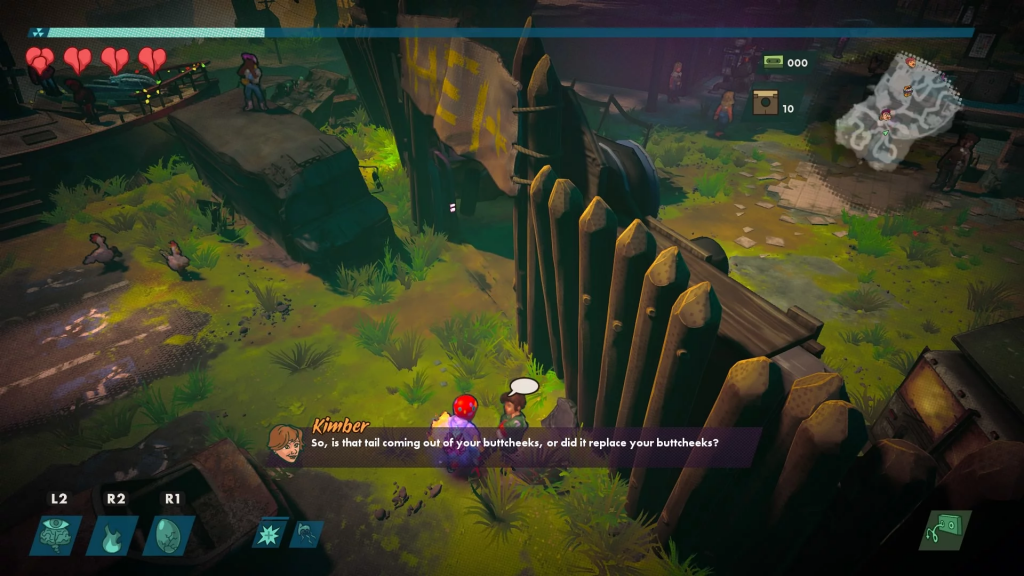 Double Fine la conosciamo, gli vogliamo bene: la Software House di Tim Schafer riesce sempre a creare titoli fuori di testa, spesso dal sapore agrodolce, con skin cartoon a nascondere cuori di tenebra. RAD è proprio questo: un roguelike pazzo, che scorre liscio nonostante un’anima cruda. Ma partiamo dall’inizio: il mondo, per come lo conosciamo, è finito. Prima vennero gli Antichi, la nostra civiltà, e devastarono il pianeta. Poi vennero i Guaritori, decisi a mettere a un po’ di ordine in quelle lande desolate, ma anche qui, non finì bene. E ora siamo qui e la speranza non gode di buona salute: tutti sanno che il domani non esiste e ben che vada finiremo sbranati da un orso mutato. Tanto vale divertirsi un po’. Lo scenario che Double Fine riesce a mettere su è unico come sempre: la gente ha smesso di sperare, la morte è all’ordine nel giorno in questa enorme farsa tragicomica. Televisori a tubo catodico e cabinati di Pac-Man sono i soli interessi delle persone in giro per la cittadina post-atomica dove inizia la nostra avventura: unico problema di questa simpatica gentaglia… la mancanza di energia. Non il cibo, non l’acqua, ma la mancanza di elettricità per continuare a sfidare gli amici su Street Fighter. Poesia.