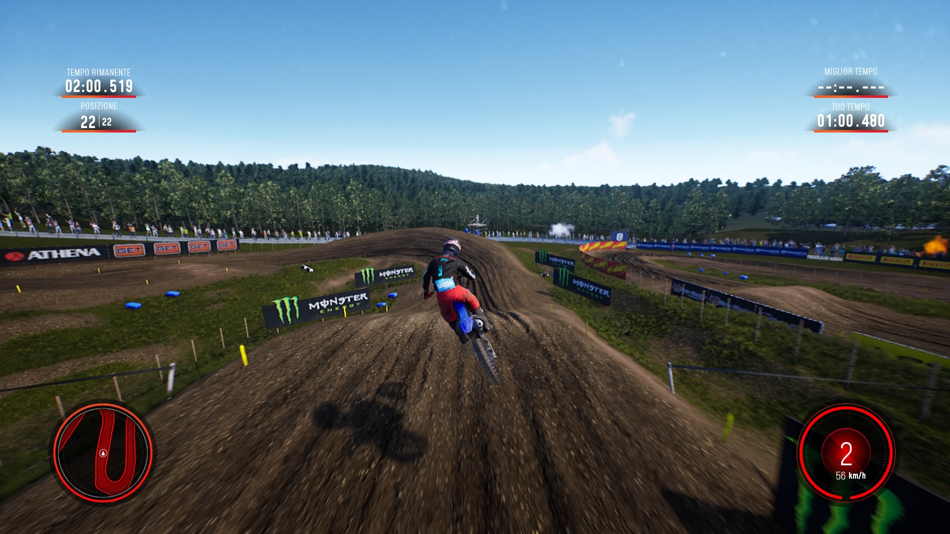 La prima corsa sarà decisamente travolgente: sentiremo chiaramente il terreno sterrato tra le nostre mani e percepiremo ogni solco che la moto attraverserà. Nella motocross è richiesta grande manualità con il mezzo: infatti, dovremo gestire le curve e l’accelerazione nel migliore dei modi per riuscire a compiere giri veloci. Avremo quindi due freni, uno con X con cui freneremo solo con la ruota anteriore e permettendoci di dare gas durante una svolta, mentre con L2 potremo decelerare con quella posteriore, arrestandoci completamente. Non dimentichiamoci dello scrub, che consiste nel scivolare su una curva, e dandoci la possibilità di uscirne alla massima velocità. Per compierne uno basterà inclinare verso l’esterno la levetta sinistra per gestire l’inclinazione della moto, ma fate attenzione, dato che se ci inclineremo troppo cadremo. Inutile dire che questa azione è difficile da padroneggiare e che richiederà tanta pratica ma in compenso, se utilizzata sulle giuste curve, ci permetterà di avere un sprint in più sugli altri.