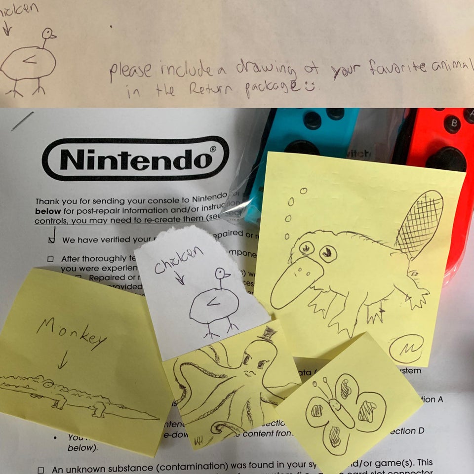 Che dire, non sempre il servizio clienti di Nintendo Support viene contattato da persone necessitanti di consigli, riparazioni o intenti a lamentarsi per qualcosa andato storto. Vi riportiamo la curiosa storia dell’utente hprumbbor, il quale aveva si un paio di Joy-con da sistemare, ma anche una inusuale richiesta che è stata esaudita. Assieme ai controller era stato chiesto agli operatori del caso di disegnare su dei foglietti i propri animali preferiti per poi spedirli insieme col pacco di ritorno. Il risultato ve lo lasciamo qui sotto, a voi lettori il giudizio artistico.