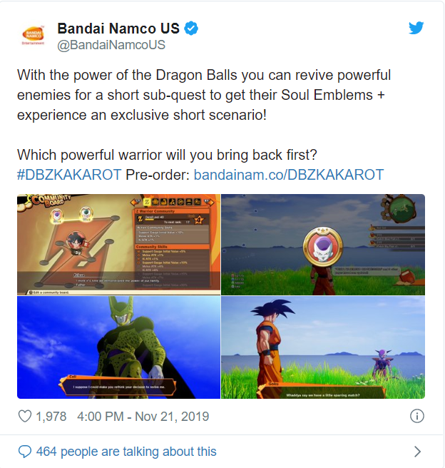 All’inizio del prossimo anno, i fan del celebre manga di Akira Toriyama riceveranno una grande sorpresa grazie agli sviluppatori di CyberConnect2 e al loro nuovo action RPG, Dragon Ball Z: Kakarot, in uscita il 16 gennaio 2020. Il titolo seguirà per la maggior parte gli eventi dell’intera saga Z, ma attraverso un tweet di Bandai Namco US abbiamo scoperto che i giocatori potranno alterare in piccola parte gli eventi di gioco. Infatti raccogliendo tutte e sette le sfere del drago avranno il potere di far tornare in vita gli antagonisti deceduti. Facendo ciò gli utenti avranno accesso ad alcune brevi quest secondarie collegate al cattivo resuscitato, da cui ricaveranno un grande numero di punti esperienza ed “emblemi dell’anima” che potranno essere usati nella bacheca comunità per ottenere nuove abilità. In ogni caso, presumibilmente, questa caratteristica non dovrebbe avere nessun impatto sulla narrativa principale. Ricordiamo che il titolo uscirà per PlayStation 4, Xbox One e PC. Per rimanere aggiornati su Dragon Ball Z: Kakarot, continuate a seguire VMAG.