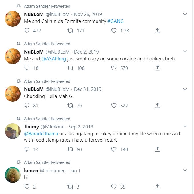 Dopo solo alcuni giorni dall’hackeraggio dell’account Twitter di Mariah Carey, sembra che ora sia il turno di Adam Sandler. Infatti è possibile trovare sul suo profilo diversi post condivisi da altri utenti, tra cui spicca maggiormente @iNuBLoM, lo stesso della volta precedente. Questo gruppo malintenzionato è noto come Chuckling Squad. Uno dei peggiori esempi è stato il retweet del messaggio di @MJerkme, diretto a Barack Obama, che ha definito l’ex presidente un “Orango Tango” aggiungendo “Mi hai rovinato la vita quando hai incasinato le percentuali dei buoni pasto. Ti odierò per sempre!”. Secondo i rapporti ce ne sono stati altri di questo tipo, uno persino diretto a Donald Trump. Gli hacker hanno anche violato l’account del CEO di Twitter Jack Dorsey, utilizzando una tecnica chiamata “SIM-swapping”, in cui ingannano un provider wireless, come T-Mobile o Verizon, per prendere il controllo di un numero di telefono. Non è noto se fosse questa la tecnica usata per Carey e Sandler, ma resta comunque un caso a dir poco spaventoso.