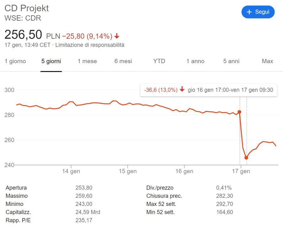 Sono ore delicate per CD Projekt Red. Dopo il rinvio di Cyberpunk 2077 a settembre 2020 la casa produttrice polacca deve vedersela con diverse problematiche. La prima è che nonostante il gioco fosse praticamente pronto il CEO di CD Projekt Adam Kicinski ha comunicato che gli sviluppatori dovranno lavorare in crunch, cioè più ore ad una maggiore intensità. La seconda pessima novità riguarda l’andamento del titolo azionario della compagnia che ha perso ben 9 punti percentuali nelle ultime ore stabilendo un’ingente perdita per la casa di sviluppo di The Witcher 3: Wild Hunt. Queste sicuramente non sono buone notizie per CD Projekt Red anche se noi speriamo che con il tempo (e le uscite) saprà riprendersi egregiamente.