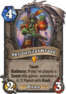 Generale dei cieli Kraggcome nel caso precedente, di base ha un costo in mana ed un body molto discordanti, ma grazie al proprio Grido Battaglia, diventa un carta molto flessibile con la possibilità di intervenire subito sul campo di gioco. La condizione per l’attivazione di tale potere non è molto esosa in termini di risorse ed in particolare è la classe dello Sciamano che più potrebbe beneficiarne, grazie alla sua carta missione che ne raddoppierebbe gli effetti.