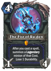 Il Pugno di Ra-Den è la prima ed un’unica arma dell’espansione. Differentemente dalle precedenti carte, questa è giocabile solo dalla classe dello Sciamano. Il costo in mana ed il body di per se non le permetterebbero di trovare uno spazio all’interno di un mazzo, ma il suo potere passivo invece la rende più che efficace in qualsiasi situazione e momento della partita. È da tenere a mente comunque che la casualità è un fattore che potrebbe essere decisivo, sia per la nostra vittoria che per la disfatta. Per tale ragione infatti non tutti i giocatori vorranno rischiare di metterla nella propria lista, ma nonostante ciò è altrettanto difficile che non trovi un ruolo nel meta competitivo.