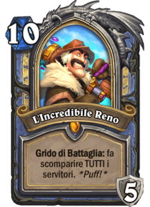 L’incredibile Reno è la nuova carta eroe del Mago. Il costo mana è piuttosto elevato ma la sua abilità lo compensa completamente. Si tratta di una rimozione totale della board: ogni servitore scomparirà dalla partita e non potrà essere rievocato nemmeno dalle magie del Prete. Il potere è di tipo passivo e dice “all’inizio del tuo turno verrà lanciata una magia casuale”, quindi similmente all’arma dello Sciamano, può sia darci vantaggio che crearci danni irreparabili, rendendo la fortuna e la casualità fattori incisivi.