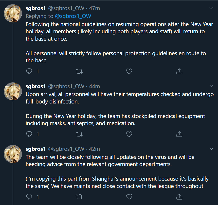 Dopo l’annuncio da parte degli Shanghai Dragons riguardante il loro ricollocamento a causa del coronavirus, i Chengdu Hunters decidono di rimanere in Cina. Nonostante la loro decisione, il management ha assicurato i fan che i giocatori e l’intero staff verranno monitorati e saranno oggetto di precauzioni estreme. Nello specifico, ogni volta che ogni membro ritornerà in sede, gli verrà controllata la temperatura corporea e otterranno un trattamento totale di disinfezione corporea. La causa di questa decisione deriva molto probabilmente dal fatto che, a differenza delle altre squadre cinesi, gli Hunters non dispongono di operatori di nazionalità coreana, ciò comporterebbe problemi nell’ottenere delle carte visa per cambiare nazione.