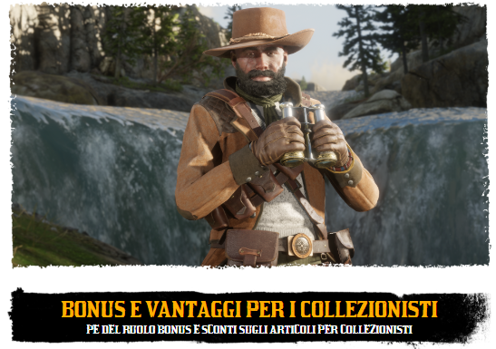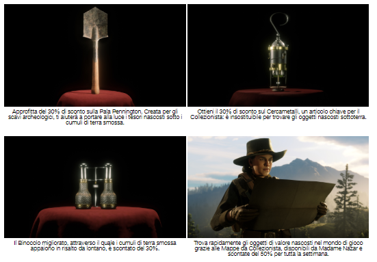 I Collezionisti di tutti i livelli d’esperienza riceveranno poi un incremento del 100% dei PE del Ruolo appena scopriranno uno qualsiasi dei tesori sparsi per i cinque Stati. In più, il raddoppio dei PE del Ruolo sarà valido anche sulla vendita a Madame Nazar della collezione settimanale Febbre dell’oro o di qualsiasi altra collezione completa. Potrete trovarla sulla mappa o inviarle la collezione da qualsiasi ufficio postale. Ed ecco qui alcun articoli scontati: