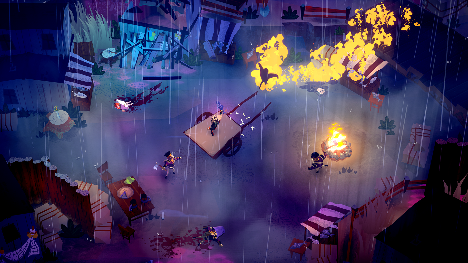 Dal punto di vista del gameplay, il titolo rende proprie le forme tipiche dei giochi d’azione arcade, fatte di combattimenti frenetici e tempismo adeguato a mettere in atto le giuste combo di attacchi che permettano di neutralizzare nel minor tempo possibile i nemici. Un livello tipico di Bloodroots è composto da un insediamento ostile e dai suoi abitanti da uccidere. Gli ostacoli sono principalmente di natura ambientale; si tratta di carretti, balle di fieno, elevazioni o depressioni del terreno, che ci costringono a trovare un modo alternativo per navigare nello scenario di gioco. In nostro aiuto ricorrono i numerosi oggetti scenici del livello, dalle scale ai barili, fino ai remi e alle… carote? Ciascun prop può essere utilizzato sia per fini offensivi che alternativi: una scala ci permette di salire, oppure possiamo usarla per brutalizzare un colono inglese. Per superare i livelli è necessario uccidere tutti gli occupanti; preferibilmente in modi rapidi e creativi, così da incrementare un punteggio di chiara ispirazione arcade. Ecco che la padronanza dei controlli e delle meccaniche pratiche del titolo si rivela fondamentale per ottenere un punteggio alto assieme alla vittoria. I nemici sono potenti al nostro pari, benché con dei riflessi meno rapidi: è necessario anticiparli con le nostre mosse per impedirgli di ucciderci con un sol colpo, costringendoci al riavvio del livello. Sterminati gli sgherri di bassa lega, ci toccherà poi affrontare mini boss e boss veri e propri, ciascuno con un proprio set di mosse e punto debole da scoprire.