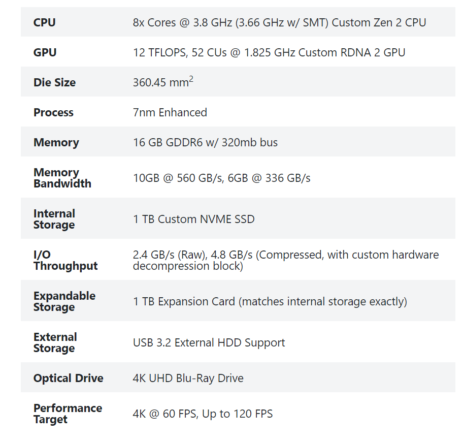 Il processore sarà un 8x Zen 2 Cores at 3.8GHz (3.6GHz with SMT), ovviamente più potente di quello della precedente console. Per la GPU, invece avremo una 12 TFLOPs, 52 CUs at 1.825GHz, Custom RDNA 2. La RAM sarà 16 GB GDDR6. Ecco di seguito le specifiche per intero.