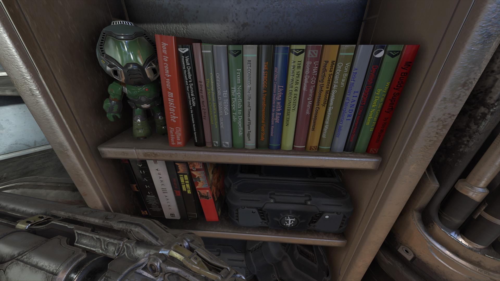 La Fortezza del Destino, rifugio del Doom Slayer, è una miniera di riferimenti, letteralmente sparsi in ogni angolo: i nomi dei file sul pc, i magazine sulla scrivania, il soul cube di Doom 3. Ma le citazioni più divertenti sono concentrate nella libreria. In cima ad essa dominano il casco e l’arma di Commander Keen, uno dei primi titoli id Software. Il ripiano più alto è una concentrazione notevole di riferimenti letterari, con titoli esilaranti basati su giochi di parole riferiti al gioco stesso. Il meglio, tuttavia, si trova nel ripiano inferiore (su cui è poggiato un pupazzo del Doom Slayer), con titoli che si rifanno principalmente al mondo dei videogiochi: Fallout, un ipotetico Prey 2, Half Life, Deus Ex, System Shock, Duke Nukem e molti altri ancora.