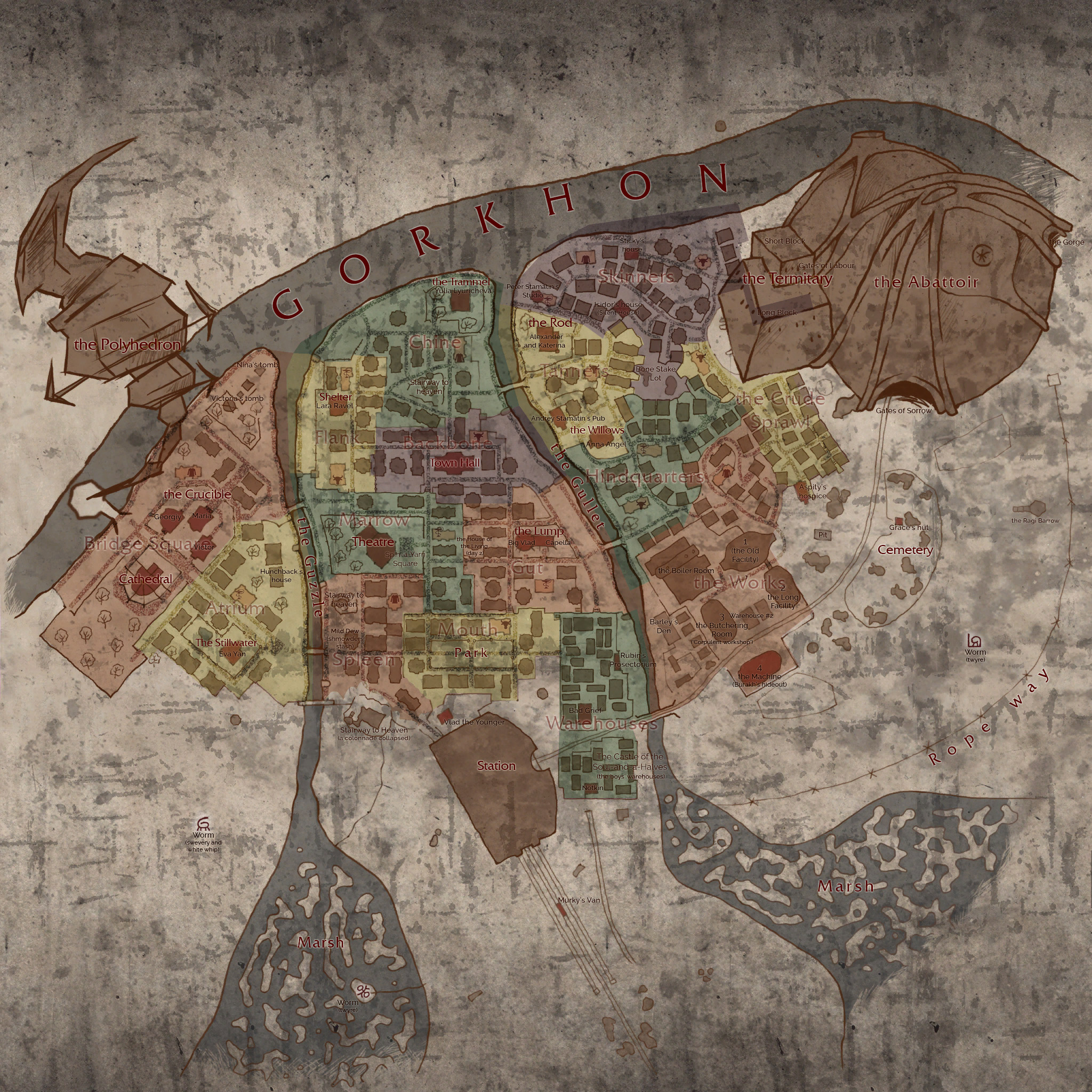 La storia narrata dall’opera si svolge nella Cittadina, un luogo non meglio precisato che viene anche denominato “La cittadina sul Gorkhon” dal nome del fiume che la attraversa dividendola in tre parti. C’è la Città Alta, la Città Media e la Città Bassa: ciascun distretto ha un edificio di riferimento ed una particolarità che la caratterizza assieme ai suoi abitanti. Per la Città Alta è il Poliedro, una costruzione irrazionale e impossibile fatta dai propri progetti architettonici: qui vive un gruppo di bambini capitanati dal più giovane della famiglia Kain: Kaspar Kain. Per la Città Media è la Stazione, l’unico mezzo di comunicazione con il mondo esterno gestito dalla famiglia Olgimsky, capitanata dall’industriale Vlad Olgimsky. Gli stessi Olgimsky controllano l’edificio di riferimento della Città Bassa: il Termitaio e il Macello, il colossale complesso architettonico visibile da tutta la città. L’economia della cittadina sul Gorkhon si basa infatti sull’industria della carne: la steppa attorno all’insediamento viene utilizzata per allevare il bestiame, poi indirizzato al Macello e ai Lavori (il complesso industriale del luogo) per essere convertito in carne, esportata in tutto il paese.