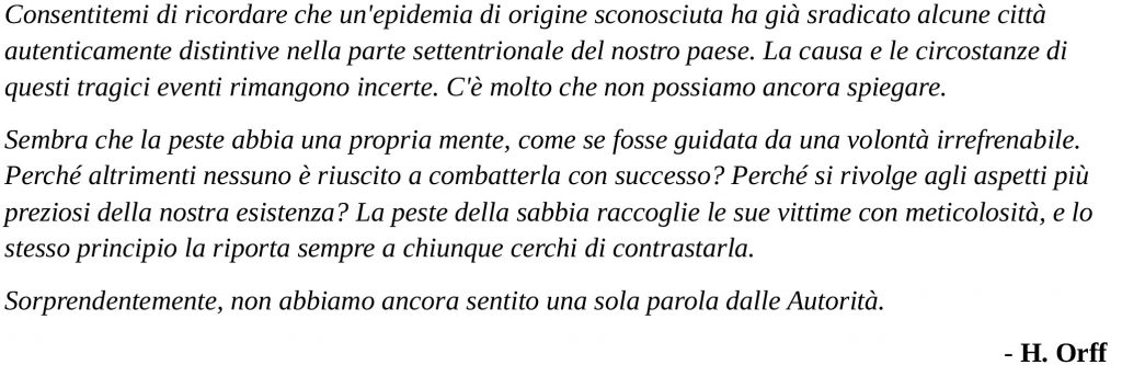 Proseguendo nella storia si scopre che il killer è decisamente più subdolo di una strega impazzita: si tratta di una pestilenza, e il suo nome è la Peste della Sabbia. Una malattia incurabile che aggredisce il sangue e abbandona chi la contrae ad una lenta e dolorosa agonia. Le personalità in prima linea nella lotta contro questo terribile morbo saranno il Laureato e l’Aruspice, sebbene in competizione l’un con l’altro. Ad aiutarli, o così sembrerebbe, saranno le tre famiglie reggenti assieme all’aiuto dell’apprendista chirurgo Stanislav Rubin.