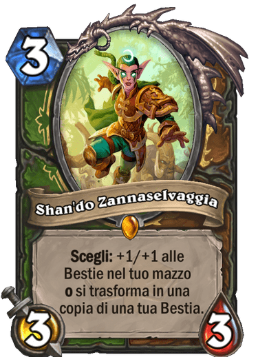 Perciò, la prima carta leggendaria di Hearthstone, Shan’do Zannasaelvaggia non è né la migliore né la peggiore della lista. Ciononostante, è davvero molto, molto forte. A costo 3, e con un body 3/3 è già di per sé un ottimo drop nel tipo di mazzo a cui è destinata: il midrange beast Hunter. Pur essendo una carta bi-classe giocabile tanto dal cacciatore quanto dal druido, è chiaro che sarà probabilmente proprio il cacciatore a giovare maggiormente della sua esistenza. Quando Shan’do entra in campo, infatti, possiamo scegliere se assegnare un +1/+1 a tutte le bestie nel nostro mazzo, o se trasformarlo in una copia di una nostra bestia in campo. Sebbene il primo effetto sia quello che risalta all’inizio maggiormente, il secondo è potenzialmente quello che farà vincere più partite. Pensate alle copie di bestie con carica potenziate che potrete creare a costo 3, alla combo Dinotamer Brann-Shan’do, per esempio. Con il primo evocate un 8/8 con carica. E con il secondo pure. Beh, che altro devo dire per convincervi?