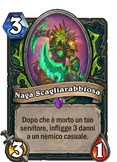 Accademia di Scholomance ha fornito, tutto sommato, poche carte all’archetipo dei miei sogni proibiti, ma tutte determinanti a farne un’opzione competitiva che non teme confronti nemmeno contro i deck TIER 1 attualmente in circolazione. Partendo dalle più costose, Guardiani Vili è una magia a costo 7 che evoca 3 taunt 1 / 2, e che si sconta di 1 ogni volta che muore un nostro servitore. Si descrive da sola. Ciclo dell’odio, poi, è un danno AOE di 3 punti a ogni servitore, che evoca un servitore 3 / 3 per ogni creatura morta per il suo stesso effetto. Non è male, spesso, sostituire i nostri 1 / 1 con altrettanti 3 / 3, magari anche eliminando qualche minaccia nemica e facendo pulizia sul terreno dei molti Aggro che incontreremo. C’è poi il sottovalutatissimo Ogromante, servitore generico 3 / 7 che evoca un taunt 2 / 2 ogni volta che l’avversario lancia una magia. Poco male se, per effetto della magia stessa, il taunt dovesse morire. Anzi, è quasi meglio. Ricordate come si chiama il nostro mazzo vero? La strategia è sempre la stessa: autodistruggere le vostre creature sfruttando carte come Naga e Nethrandamus, ma non solo, per non sprecare il loro prezioso sacrificio.