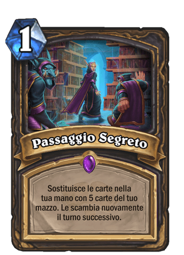 Dulcis in fundo, il motore degli aggro Rogue, una sorpresa uscita da un meta che premia l’aggro solo quando ha sempre la carta giusta al momento giusto. E quale modo migliore di averla se non cambiando la propria mano con 5 carte casuali pescate dal proprio mazzo? Poco importa se queste a fine turno tornano nel mazzo: non lo faranno. Passaggio segreto costa 1, e permette di giocare quasi tutte le carte pescate, se usata al momento giusto. Che può significare anche turno 5, chiariamoci. Inoltre, consente di trovare proprio quel removal che mancava, quel danno in più che serviva per vincere. Che in un aggro è tutto.