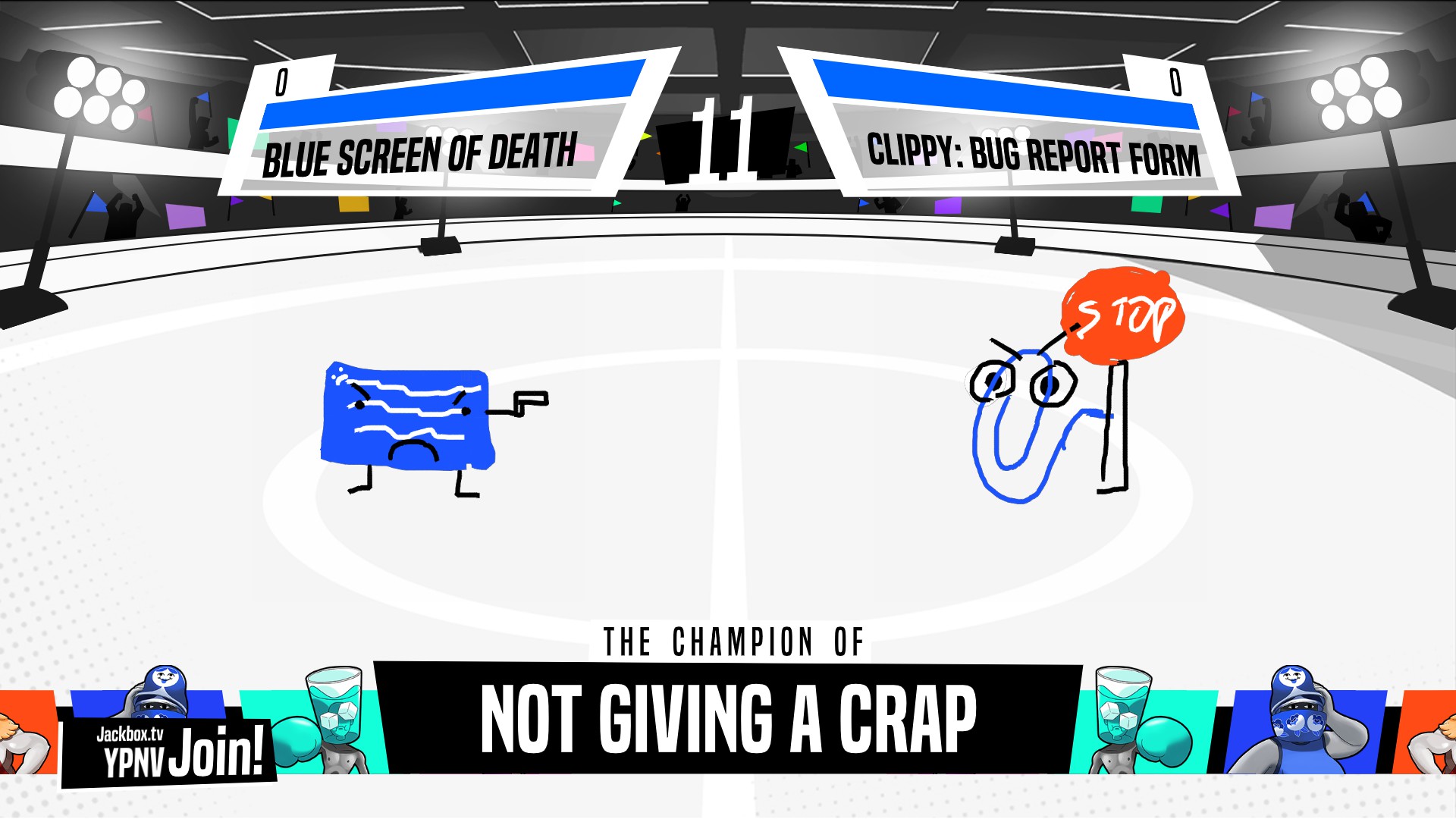 E al terzo posto (ma primo in classifica) troviamo il campione indiscusso di questo pacchetto: Champ’d Up. Qui i partecipanti devono competere in categorie assurde e bizzarre disegnando un lottatore invincibile prima, e poi uno sfidante temibile per contrastare il proprio avversario. Esattamente come in Quiplash, i giocatori si sfidano a coppie e il pubblico vota il proprio guerriero preferito. Diversi elementi contribuiscono a rendere questo il minigioco definitivo: l’atrocità esilarante dei disegni (deliziosamente realizzati a mano in puro stile Paint), la possibilità di far spanciare dalle risate i propri amici con la rappresentazione visiva delle vostre battute ricorrenti, e la capacità dei lottatori di sferrare mosse finali devastanti se conquistano il 100% dei voti. A parte con qualche foto (che potete trovare qui nell’articolo), è impossibile descrivere bene a parole il potenziale infinito di Champ’d Up, che può far letteralmente morire dalle risate anche i più resilienti per ore e ore. Questo è uno di quei giochi che sicuramente verrà proposto almeno una volta a ogni singolo raduno di amici. Varrebbe quasi la pena comprare l’intero pacchetto solo per questo. Ottimo lavoro, Jackbox Games. Se possibile, però, aumentate la palette di colori. Servono più strumenti per esprimere adeguatamente l’estro di noi creativi.