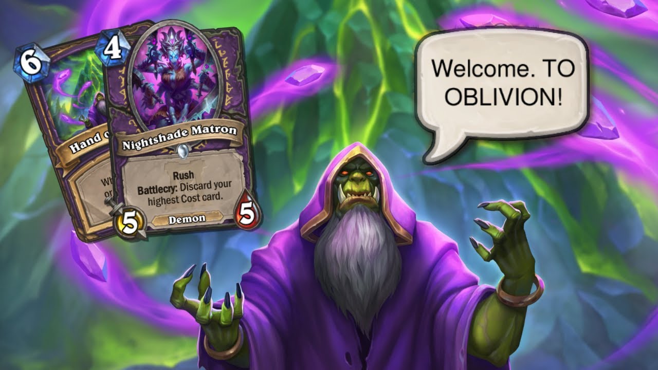 Come se lo stregone non avesse già un motore di pescata eccezionale nel suo potere eroe, il mazzo vanta una strategia eccellente, che gira intorno a Mano di Gul’dan. Quando scartata, la Mano vi fa pescare 3 carte dal deck. E di carte che vi faranno scartare dalla mano ce ne sono parecchie, tutte molto potenti. Matrona Ombranera, ad esempio, è una 5/5 con assalto a costo 4. Che, se ve la giocate bene, vi farà scartare per forza Mano di Gul’dan, aggiungendo quindi al suo effetto la triplice pescata di cui sopra. Eccezionale, non trovate?