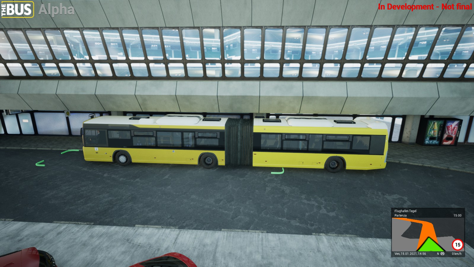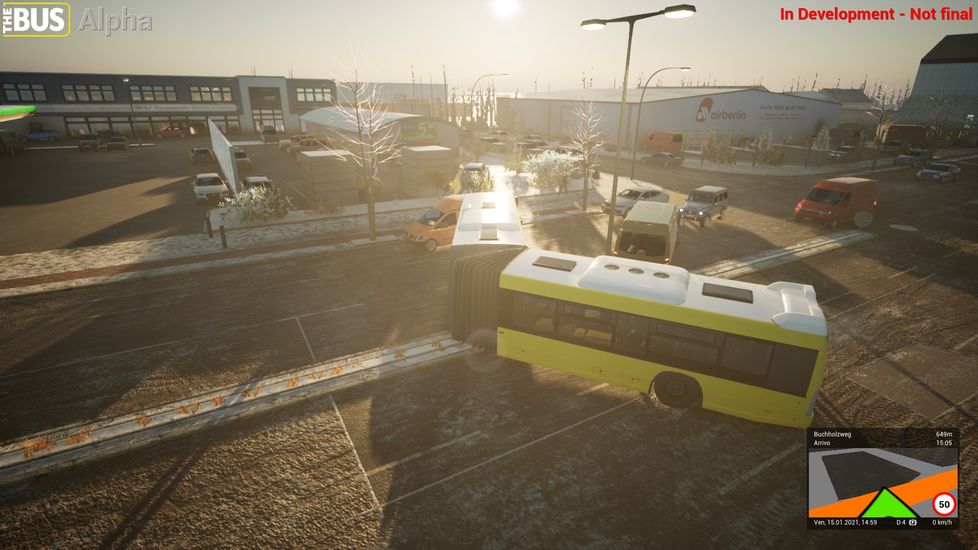 La mia esperienza su The Bus è cominciata in un pomeriggio soleggiato, alle ore 15 presso la stazione centrale di Berlino. A ricordarci che si tratta di un work in progress, una luminosa scritta rossa in alto a destra che ci seguirà per tutta la nostra esperienza. Devo ammettere di non giocare spesso ai simulatori, anche se in passato sono stato in fissa con i vari Flight Simulator o simulatori geopolitici come quelli Eversim, ma il mondo della simulazione di trasporto pubblico è totalmente nuovo per me. Solo così riesco a spiegare la mia spaesatezza quando si è trattato di comprendere i comandi del gioco. Siccome l’esperienza paga, farò in modo di dare una mano a chi intende provare il gioco con le mie stesse mancanze: all’avvio di ogni sessione è possibile determinare lo schema dei comandi – realistico o arcade. Per i meno esperti arcade è sicuro la scelta migliore.