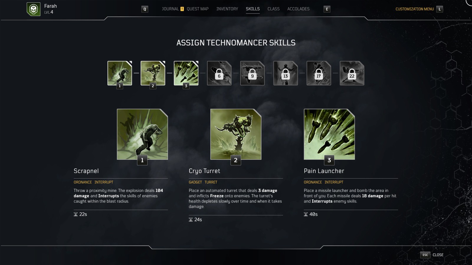 Anzitutto una precisazione doverosa: sappiate che potete resettare lo skill tree in qualunque momento della partita senza perdere i punti accumulati, e riassegnarli a vostro piacimento. Grazie Outriders. Perchè, sapete, non è “difficile” accumulare punti quando vogliamo resettare il nostro PG. E’ solo noioso. Mia opinione eh, ma andiamo avanti. La “strada” che vi consiglio di intraprendere qualora vogliate diventare dei piccoli giocatori solitari alla ventura con il Tecnomante è quella dello Sciamano. In particolare, nel vostro setup non possono mancare queste skill: