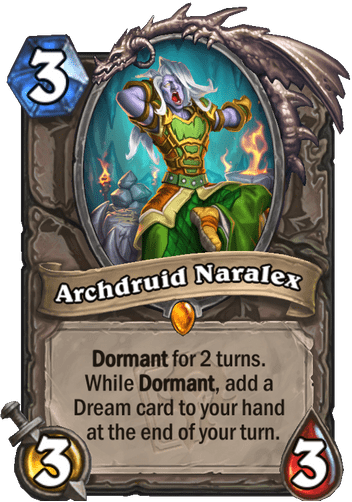 Immancabile la citazione e il plauso per due delle migliori carte del Mini-set Caverna dei Lamenti. Due motori velocizzanti che aiutano a portare a compimento le strategie del deck il prima possibile, al meglio possibile. La prima è Cavernologa Ancestrale, che a costo 3 ci fa pescare una magia, e se è di tipo natura, anche un minion Elementale. Cosa accadrebbe se il vostro mazzo avesse solo magie natura ed elementali? Profit. Infine, Arcidruido Naralex, leggendaria a costo 3, body 3/3, che resta dormiente per due turni sul terreno. E al termine di ciascuno, ci dona una carta SOGNO nella mano. Sappiamo tutti quanto siano performanti le carte SOGNO: serve dire altro? Non credo.
