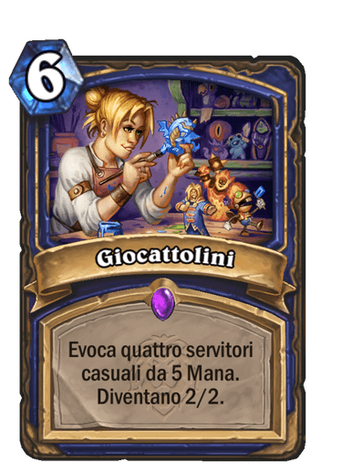 Altra candidata per un nerf quasi immediato è Giocattolini, una nuova epica del mago. Per proseguire sull’onda dello SPell Mage, e potenziare ulteriormente un mazzo già molto fastidioso anche senza nuovi tool, Giocattolini fa evocare a costo 6 (che sappiamo bene verrà ridotto in breve tempo a 5 o addirittura 4) ben quattro servitori casuali da 5 mana. E fra i 5 mana, oltre a molti rantoli di morte, Scudi divini, assalto ecc., ci sta anche il Provocazione 7/8 dello Sciamano, per dire. Allora? Allora GIocattolini riduce a 2/2 il Body dei servitori evocati. Basterà a non far diventare tossica Giocattolini? Non credo. Staremo a vedere!