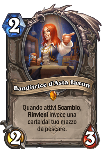 Banditrice d’Asta Jaxon mi consente di svelarvi la nuova meccanica dello SCAMBIO, presente in molte nuove carte di Uniti a Roccavento. Una carta con Scambio può essere rimessa nel mazzo per attivare il suo effetto SCAMBIO al costo di 1 mana. Poi, dobbiamo pescare una nuova carta dal grimorio. A meno che non abbiamo in campo la Banditrice, che ci farà rinvenire, anzichè pescare, la suddetta nuova carta. E fa tutta la differenza del mondo. La meccanica del rinvenimento ha bisogno di un’aggiustata: è davvero troppo forte. Secondo noi, complice il requisito basso della meccanica SCAMBIO e della Banditrice, questa carta sarà una fra le prime ad essere nerfata.