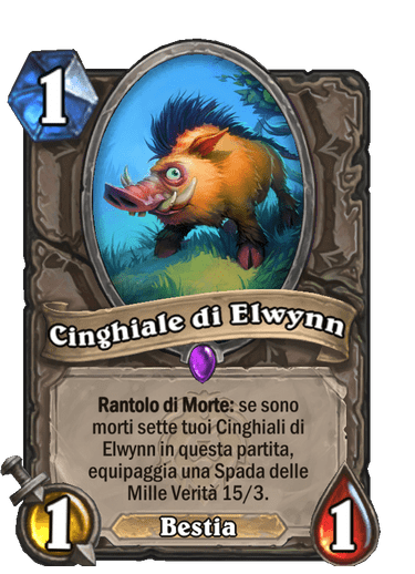 Creatura EPICA, Costo 1/Body 1-1/Rantolo di Morte: se sono morti sette tuoi Cinghiali di Elwynn in questa partita, equipaggia una Spada delle Mille Verità 15/3.