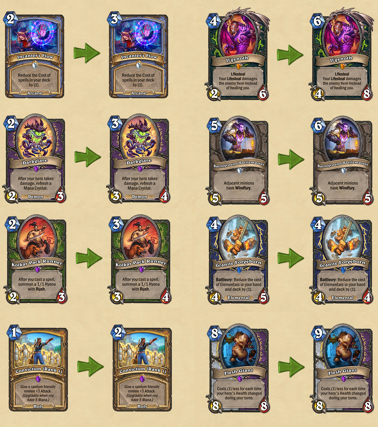 Prima: [Costo 4] 2 Attacco, 6 Salute → Ora: [Costo 6] 4 Attacco, 8 Salute.