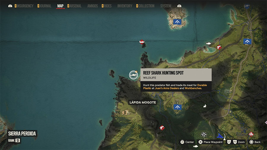 Con il prossimo bersaglio della nostra lista ci vorrebbe probabilmente l’aiuto di Jack Sparrow o di Davy Jones; e probabilmente quest’ultimo per le sue sembianze ittiche potrebbe essere più adatto. In ogni caso, chiunque decidiate di chiamare per farvi dare una mano, la bestiaccia la troverete al centro della suddetta insenatura di Cobre Shores, ma forse è più semplice beccarla nella costa immediatamente a Nord dopo Làpida Mogote. Un nome… lapidario, per uno squalo!