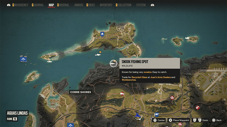 Predatori insaziabili e feroci, questi simpaticoni fortunatamente non si avventurano così vicini alle coste della terraferma: volete mettere un morso al vostro alluce ad ogni bagno!? Dunque, per provare a pescarli avrete di sicuro bisogno quantomeno di un gommone, e la zona dove si ritrovano è principalmente a largo di Libertad Island, ad Est. Fate scorta di cerotti, e occhio alle meduse!