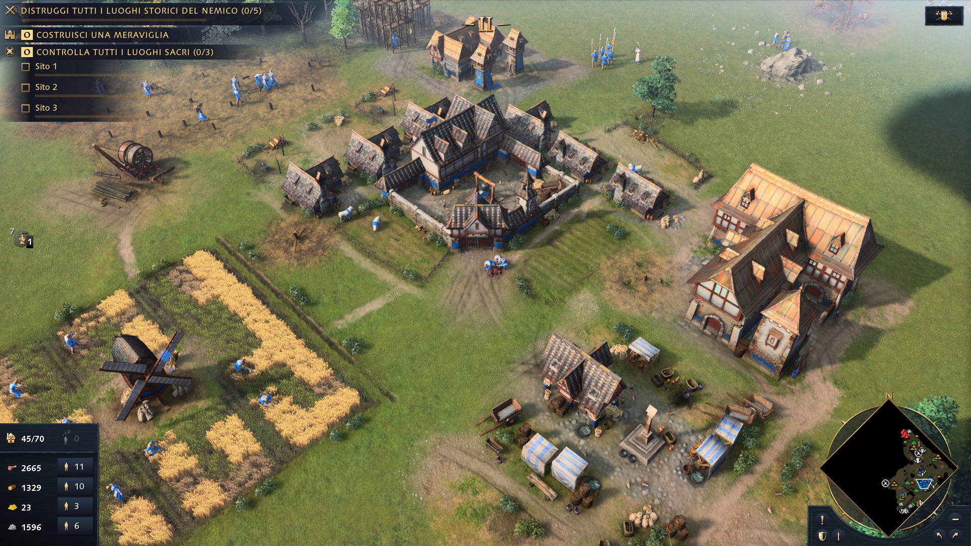 Proseguiamo le nostre analisi dedicate ad Age of Empires IV saltando immediatamente a bordo, confrontandoci dunque con una schermaglia classica contro l’intelligenza artificiale del gioco. Qullo che salta subito all’occhio rispetto ad Age of Empires III è senza esitazione un ritorno all’apparato meccanico e funzionale di Age of Empires II, senza esitazioni definibile il più noto e il preferito dai cultori della saga. Sebbene il potenziale strategico e ludico del capitolo precedente aveva trovato degli interessanti sbocchi dal sistema delle “carte”, il fatto che si sia voluto ritornare al passato con un’economia e un sistema strategico basato sull’estrazione delle risorse sarà senza dubbio gradito. Rimangono ovviamente dei metodi alternativi di accrescimento economico che fortunatamente si rivelano meno maggiorati rispetto alla precedenza, cosa che faciliterà di molte spanne il bilanciamento dell’opera. Oltre alle modalità di vittoria ben note (distruzione dei nemici o costruzione e difesa di meraviglie), ci sono nuovi modi di vincere una partita, ovvero, la distruzione di tutti i luoghi storici (edifici speciali) del nemico o il controllo di tutti i luoghi sacri. Si tratta di aggiunte che di sicuro saranno gradite dall’utenza, in quanto aumentano le possibilità e le opzioni disponibili ad ogni giocatore, elevando il grado di strategia di ogni partita.