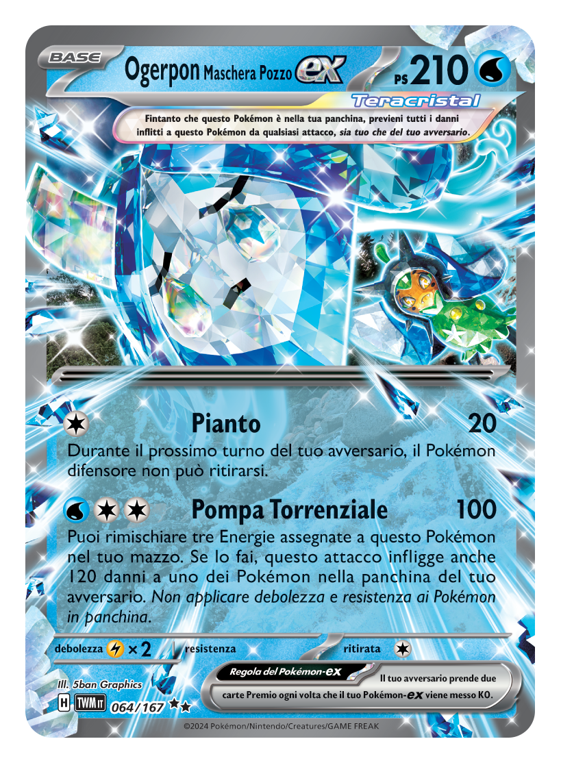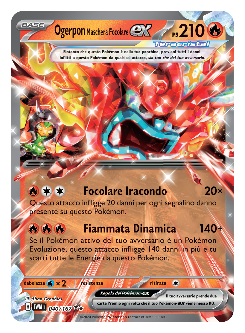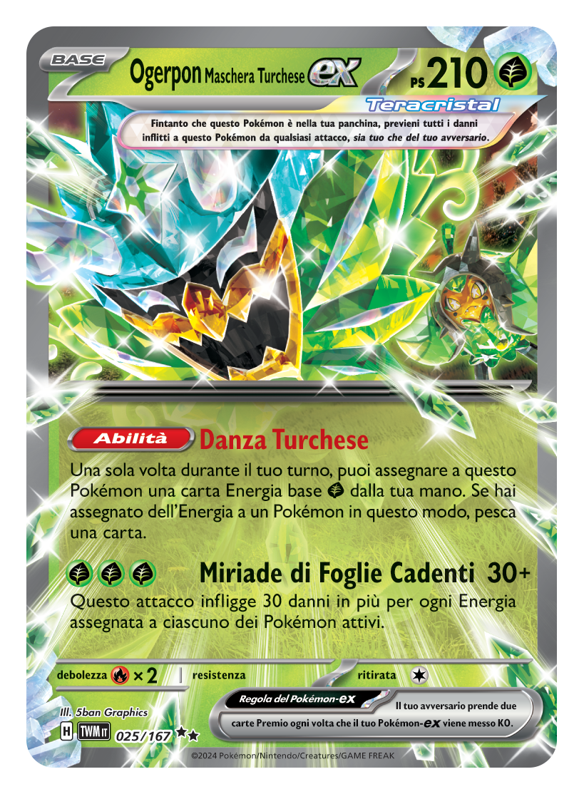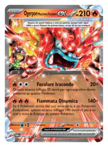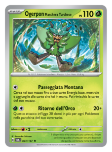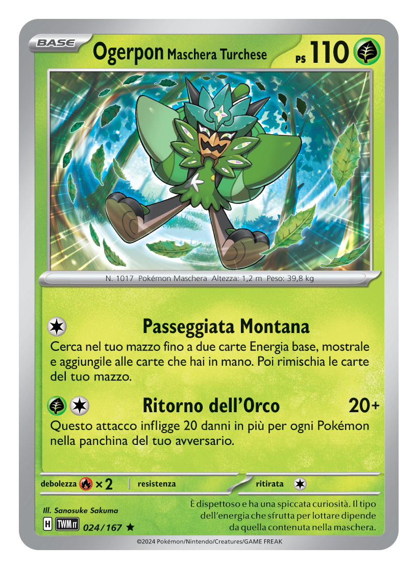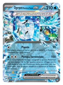 Si potrà lottare con Ogerpon-ex di tipi diversi utilizzando Maschera dell’Orco, una nuova carta Strumento che consente di sostituire qualsiasi Ogerpon-ex in gioco con un altro Ogerpon-ex nella pila degli scarti. Per festeggiare il debutto di Ogerpon nel GCC Pokémon, sono state svelate sei nuove carte dell’espansione con protagonista il Pokémon Maschera: Ogerpon Maschera Turchese-ex, Focolare-ex, Pozzo-ex, Fondamenta-ex, Turchese e dell’Orco.