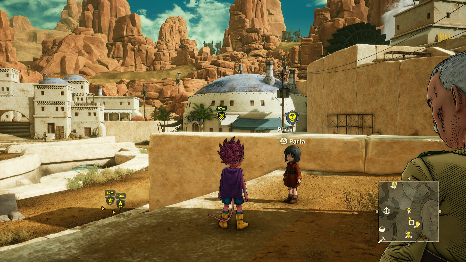 Come detto all’inizio, il deserto delle Sand Land è quasi sconfinato, cosa che potrebbe scoraggiare i giocatori meno esperti quando si parla di videogiochi open world come questo e che forse – incuriositi dalla firma illustre di un mangaka come Akira Toriyama – intraprenderanno con questo titolo la loro prima avventura in un mondo (quasi) del tutto libero. Ebbene, il primo consiglio che ci terrei a darti in casi come questo è quello di restare in allerta. Spesso infatti, la vista può essere il nostro alleato più efficace per individuare luoghi nascosti come grotte, rovine o anche villaggi abbandonati o anche elementi visibili all’orizzonte come le imponenti Torri Radio, utilizzabile per espandere la propria visuale sulla mappa. Tutti posti ricchi di risorse e soprattutto nemici da sconfiggere, anche solo per aumentare di quel tanto che basta il proprio livello e ottenere nuove abilità. In alternativa, in basso alla destra dello schermo verrà in soccorso anche l’interfaccia grafica del gioco, mostrandovi una piccola ma del tutto leggibile visuale della mappa attraverso un semplice radar. Una volta giunti infatti nei pressi di uno o più punti d’interesse, il radar posizionerà un semplice segnalino permanente sulla mappa di gioco, in modo da facilitarti ulteriormente la vita nel caso volessi visitare questi posti in un secondo momento.