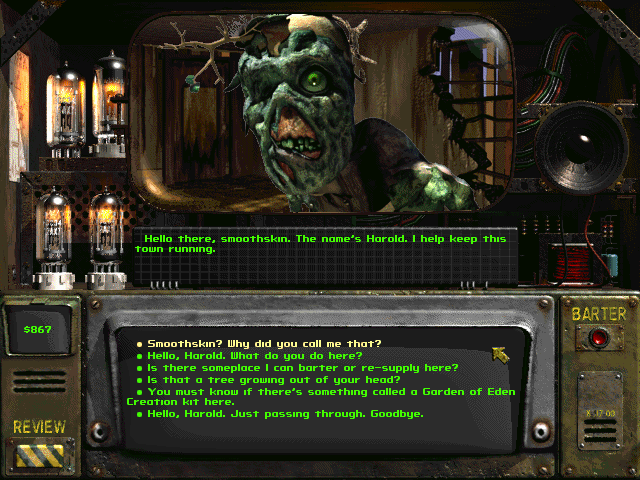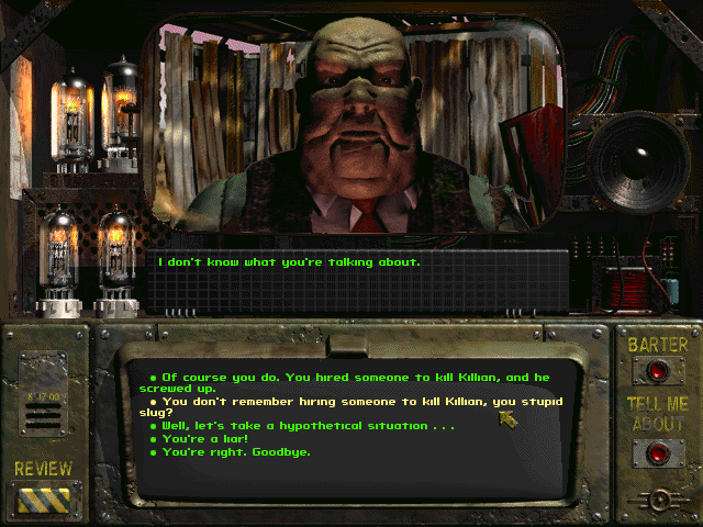 Il primo Fallout si apre con un’introduzione impressa a fuoco nelle menti di quanti vi assistettero all’epoca: una panoramica in bianco e nero sul futuro retromoderno che rappresenta il fulcro dell’ambientazione, pieno di tecnologia avulsa dal proprio contesto temporale e di soldati in armatura pesante che abbattono i dissidenti sulle note di Maybe degli Ink Spots, seguiti dal celebre monologo di un ispirato Ron Perlman che afferma come la guerra, i conflitti, le motivazioni che spingono gli uomini a combattere fra di loro non cambino mai, nemmeno quando gli stessi hanno provocato la totale e irreversibile demolizione della società. Le parole introduttive dipingono alla perfezione i dolorosi trascorsi del mondo nel quale il giocatore si appresta ad entrare, e lo stesso accade durante le prime ore di gioco, incentrate sull’espediente narrativo del “mostra, non raccontare” utile per farlo calare al meglio nel contesto senza affogarlo in un mare di informazioni ridondanti. La missione principale, che ci vede impegnati nel recupero di un nuovo chip necessario per la purificazione dell’acqua del nostro Vault, è ben strutturata ma non costituisce il fattore principale che ci spinge a progredire, eccezion fatta per il limite di 500 giorni imposto per completarla (comunque rimosso con una patch) pena un prematuro game over: tale stimolo va piuttosto ricercato nel fitto intreccio di sottotrame che si snoda fra i pochi centri abitati sorti dalle rovine che costellano la superficie, e dalle creature (umane o meno) che li abitano, causa diretta o riflessa dei contrasti interni che saremo chiamati a risolvere.