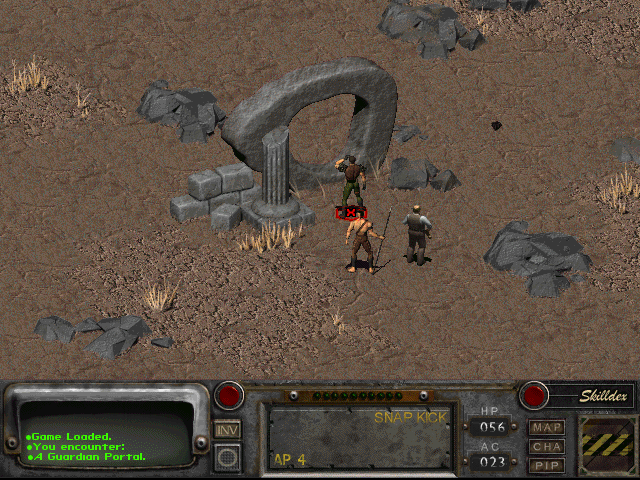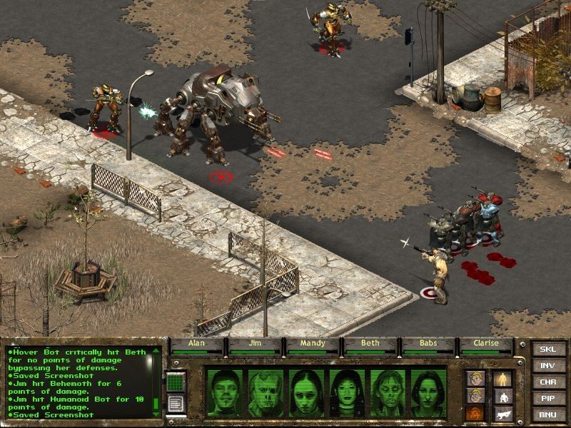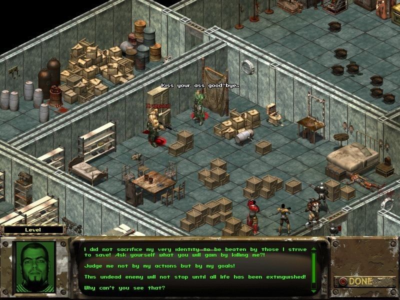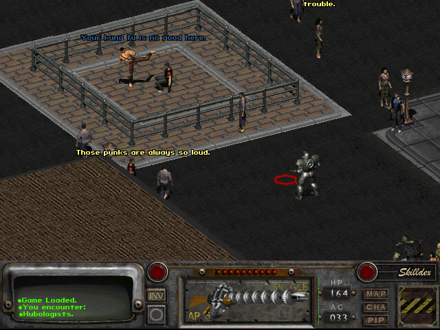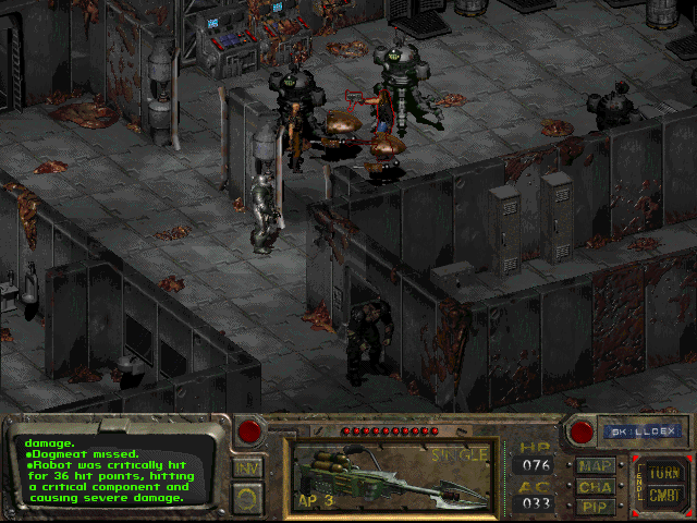 L’autentico fascino di Fallout risiede proprio in questa eterogenea mescolanza di caratteri e situazioni, elaborata per affrescare una porzione discontinua di (ex) Stati Uniti che, per quanto accomunata dall’istinto di autoconservazione, inizia a porsi il problema di come ripristinare i concetti di popolo e di governo, esplorando soluzioni spesso fin troppo totalitarie. L’ascendente del protagonista sulle questioni che emergeranno di volta in volta può spaziare dalla mediazione diplomatica all’intervento armato, passando per tutta una serie di sfumature di grigio intermedie sulle quali influiscono le circostanze ed i punteggi di caratteristica, sempre in virtù della filosofia di conferire a tutti gli attributi dello SPECIAL il medesimo rilievo: il gioco non forza mai la mano su una specifica alternativa e, posto di avere punteggi sufficientemente alti ed un pizzico di fortuna, consente di raggiungere la giusta conclusione del nostro pellegrinaggio senza mai menare le mani, o quasi. Non che ci sia nulla di male, comunque, perché il combattimento è un altro dei suoi punti di forza: Fallout adotta una prospettiva isometrica fissa e gli eventuali scontri si svolgono sul medesimo scenario nel quale vengono provocati, rivestito da un’appropriata griglia per evidenziare gli spazi di manovra delle unità coinvolte. Il sistema è a turni alterni e si basa sulla gestione di un certo quantitativo di punti azione, che è possibile spendere per muoversi, portare attacchi e migliorare l’efficacia delle proprie azioni, come prendere di mira una specifica parte del corpo per infliggere penalità assortite. Oltre alle caratteristiche di base, durante le battaglie entrano in gioco anche i tratti impostati in fase di creazione del personaggio ed i benefici scelti al passaggio di livello, che condizionano le prestazioni complessive e possono scatenare effetti aggiuntivi, tanto benefici quanto malsani. Sono meccaniche molto più complesse da spiegare che da comprendere, integrate in maniera da risultare estremamente intuitive dopo averci preso la mano perché, come il resto del gioco, sono state pensate per gratificare quanti vogliono immergersi appieno nelle loro dinamiche.