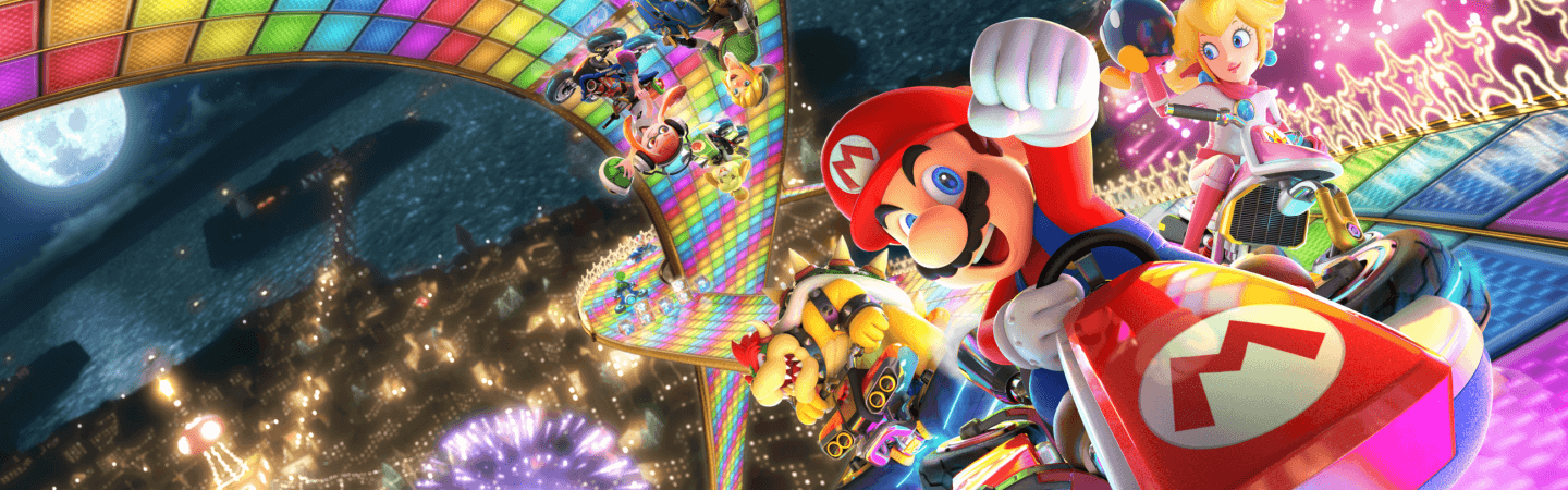 โ— Mario Kart 8 Deluxe, il Mario Kart piรน accessibile di sempre, con 48 circuiti per corse mozzafiato in sella ai kart insieme ad amici e famigliari.